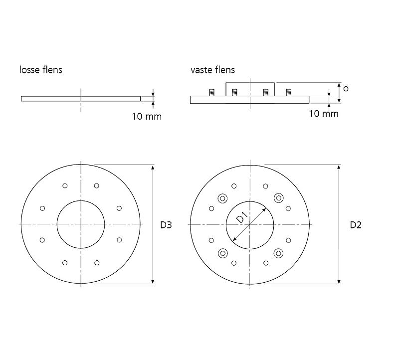 D1: Toevoerbuis Øbinnen, D2: Vaste flens Ø, D3: Losse flens Ø