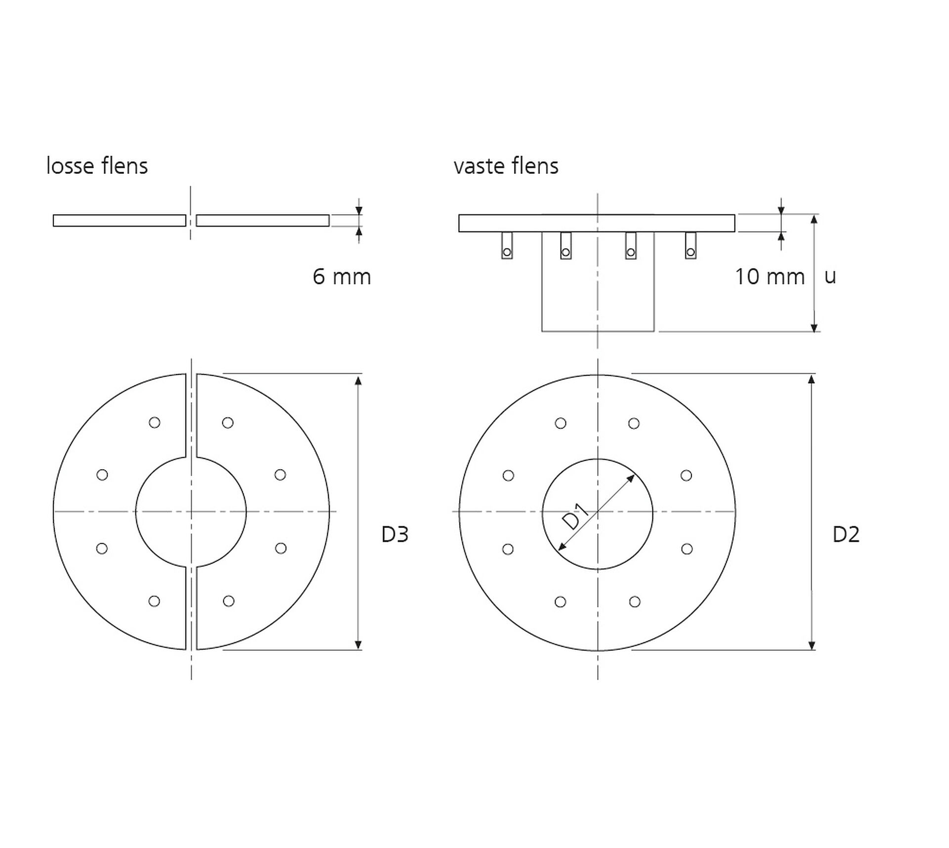 D1: Toevoerbuis Øbinnen, D2: Vaste flens Ø, D3: Losse flens Ø